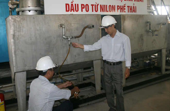 TS Tâm cho biết thêm công nghệ tái chế rác thải nilông thành dầu đốt được thực hiện qua các quá trình tách loại tạp chất và xử lý nilông, quá trình nhiệt phân xúc tác phá vỡ cấu trúc mạch polymer của nilông và quá trình tách phân đoạn sản phẩm. Sản phẩm dầu đốt có nhiệt trị cao từ 10.000 -11.000 Kcal/kg sẽ là nguồn nhiên liệu tốt có thể thay thế một phần hoặc 100% cho các lò đốt đang sử dụng dầu DO và FO hiện nay.