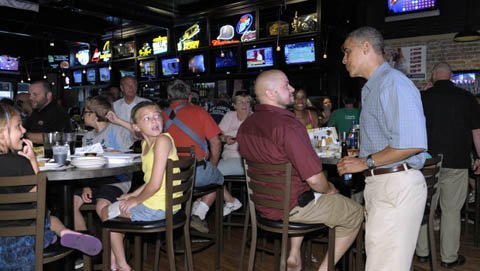 Tổng thống Mỹ đã nhận được những chàng pháo tay và bước qua những ánh đèn flash khi bước vào quán bar Ziggy, một trong những tụ điểm về đêm quen thuộc của người dân Amherst, Ohio. Khi đó, một trong những màn hình TV đang quay cảnh một phóng sự của CNN về quỹ tranh cử lên tới 100 triệu USD trong tháng 6 của Mitt Romney.