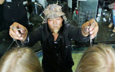Chuyên gia người Trung Quốc giữ cho đôi mắt nhắm tịt trong khi tay cầm 2 cây kéo sắc và thể hiện "tài năng" cắt tóc của mình. Ông hiện sẵn sàng đáp ứng nhu cầu của khách hàng tại salon tóc của mình ở Tây An. Vị chuyên gia mang phong cách "ăn mày" này cho biết, ông chưa từng gặp tai nạn nào với những cây kéo.