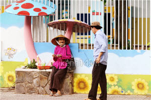 Ông cụ với đôi nạn, cầm cọc vé số trên tay đi mời các vị phụ huynh. Dường như ông đến mời từng người một.
