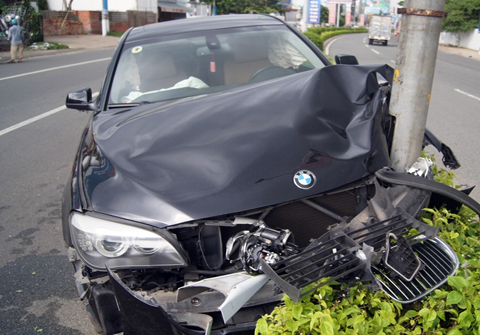Khi đến đoạn cua, ôtô bất ngờ lao thẳng lên dải phân cách, cày nát một đoạn cây xanh. Chiếc xe sang chỉ dừng lại sau khi đâm vào trụ đèn chiếu sáng. Sau cú tông, đầu chiếc BMW bẹp rúm, nhiều bộ phận bị vỡ văng ra ngoài. Cả 8 túi khí đều bung ra nên 4 người trên xe không bị thương.
