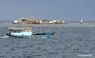 Photo news.cn. Chiếc tàu đầu tiên thuộc 30 tàu đánh cá TQ có tàu ngư chính hộ tống, đã đến đảo Chữa Thập – mà Trung Quốc gọi là đảo Vĩnh Thử – của Việt Nam thuộc quần đảo Trường Sa vào ngày 15 tháng 7, 2012.