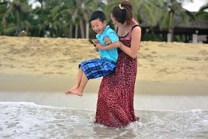 (ĐVO) Jennifer Phạm đưa bé Bảo Nam tới bãi biển Palm Garden, Hội An trong khi cô tới đây để làm giám khảo cuộc thi Miss Ngôi Sao 2012. Hai mẹ con nô nghịch hồn nhiên với sóng nước.