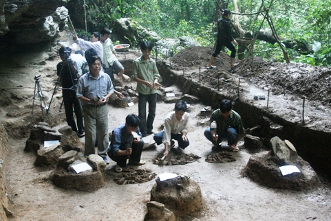 Sau khi làm lễ động thổ, ông Chung đă trực tiếp bổ nhát cuốc đầu tiên để thăm ḍ. Khi đào sâu được khoảng 40cm, đoàn khảo cổ phát hiện nhiều công cụ bằng đá và các dấu tích cổ như: than tro, vỏ ốc suối, ốc núi, các vật dụng sinh hoạt và nhiều xương động vật vương văi.