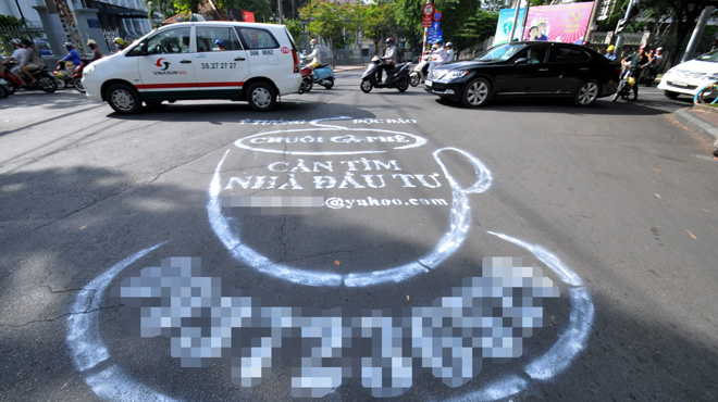 Nội dung quảng cáo là cần tìm nhà đầu tư cho chuỗi cà phê - ý tưởng độc đáo. Địa chỉ email và số điện thoại di động liên lạc được sơn vẽ với kích cỡ khá to ngay trên mặt đường.