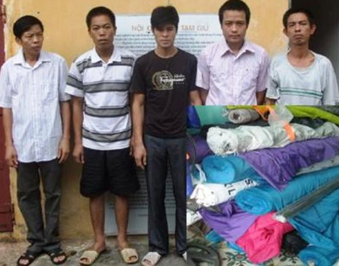 5 người bị tạm giam trong vụ trộm cùng tang vật. Ảnh: T. Thanh.