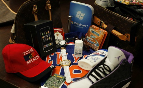 Các mặt hàng giả bị nhà chức trách Mỹ tịch thu được mang ra trưng bày - Ảnh: Reuters |