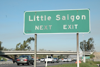 Một tấm bảng trên xa lộ 405 tại Orange County hướng dẫn vào khu Little Saigon ở Westminster. Một nghị viên ở San Jose và một dân biểu California đang vận động để có bốn tấm bảng như vậy ở xa lộ 101, đoạn thuộc San Jose. (Hình: Ðỗ Dzũng/Người Việt)