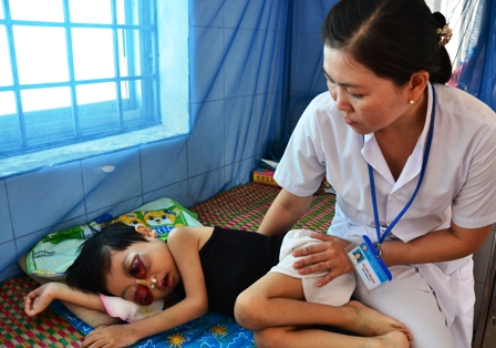 Thời gian gần đây, những ai đến khoa Nhi B, BV Đa khoa tỉnh Bình Định đều không thể cầm lòng trước tình cảnh thảm thương của cháu bé 5 tuổi Võ Thành Hưng, con út của anh Võ Ngọc Tuấn và chị Nguyễn Thị Thu, ngụ ở Phường Nguyễn Văn Cừ, Quy Nhơn. Cháu bé người ốm nhách, nằm co ro trong tư thế nghiêng về bên phải để bớt nặng nề, đau đớn khi hai con mắt bị lồi như hai khối thịt muốn rơi hẳn ra ngoài. Người không yếu tim cũng phải giật mình khi nhìn hai con mắt đen đen, đỏ đỏ của cháu nằm bên ngoài hốc mắt như chực nổ tung.