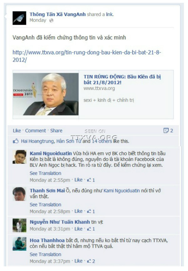 Như các tềnh yêu đă biết, TTXVA.ORG là website đầu tiên đăng tin có xác minh thông tin bầu Kiên bị bắt, mà hơn 10 giờ đồng hồ sau báo chí chính thống Việt Nam mới lên tin! V́ vậy đă nhận được sự quan tâm đặc biệt của báo giới cũng như bạn đọc!