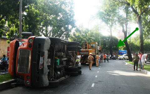 Xe đầu kéo lật nghiêng giữa trung tâm Sài Gòn