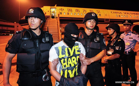 Nghi can Xiong Yi bị áp giải tại sân bay Vũ Hán hôm qua. Ảnh: Xinhua
