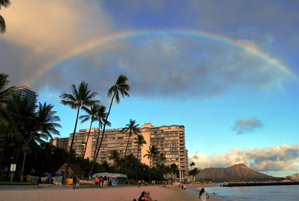 Thời điểm hợp lý nhất để ngắm cầu vồng ở Honolulu có lẽ là vào lúc hoàng hôn. Bạn sẽ được chiêm ngưỡng cả một bầu trời nhuộm đỏ của ánh Mặt trời và nhất là khi ấy, cầu vồng cũng chỉ có một sắc đỏ mà thôi.