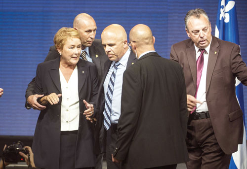 Vệ sĩ bao quanh bà Marois sau vụ nổ súng - Ảnh: AFP