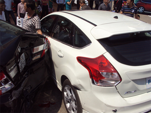 Vụ tai nạn xảy ra tại khuôn viên triển lãm Giảng Võ, Hà Nội sáng 30/9. Chiếc xe Focus mới của Ford Việt Nam đã mất lái, lao thẳng vào hàng rào chắn bằng vải ngăn cách 2 khu thử xe Ford và Honda, xoay vòng rồi va chạm vào phần đuôi xe Civic đang dừng đón khách thử xe trong khu vực của Honda Việt Nam.