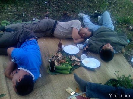 Chiến trường la liệt những lon đă hết được rải khắp pḥng, mùi bia xông lên nồng nặc, trên bàn ngổn ngang thức ăn thừa và cả bia thừa nữa. Số c̣n lại quyết định đi uống tiếp. Vừa bước ra cửa, một anh bạn của tôi nôn thốc nôn tháo ngay trước mặt mọi người, tôi nh́n thấy chợt tỉnh cả người và quyết định đi về.