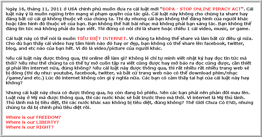 Cái "NDAA - National Defense Authorization Act" đã thành luật và ông Obama đã ký từ đầu năm nay rồi. Mình không có nói xạo ok. Các bạn không tin thì lên YOUTUBE hoặc GOOGLE search "NDAA - National Defense Authorization Act" này đi ok.