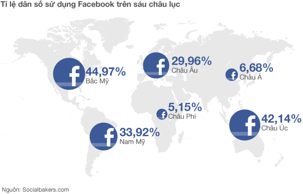 Bản đồ tỉ lệ người sử dụng Facebook trong dân số thế giới trên sáu châu lục.