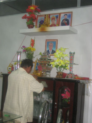 Mới bước vào cửa nhà ông Bảo Tài, h́nh ảnh đầu tiên đập vào mắt khách là bàn thờ đơn sơ nhưng toát lên vẻ trang trọng với di ảnh là vua Thành Thái chỉnh tề trong áo bào màu đỏ, đội mũ xung thiên (một loại mũ chỉ dành cho vua triều Nguyễn); phía dưới là di ảnh của hoàng tử Vĩnh Giu, phong thái rất trí thức với áo vét và cặp kính trắng.