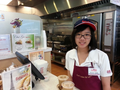 Ngọc Tâm Quách, 16 tuổi, hiện làm thêm tại Lee's Sandwiches, cho biết: “Con bắt đầu làm từ hồi Hè lúc không đi học. Hồi đó làm hai mươi tiếng một tuần, giờ đi học lại nên làm mười hai tiếng. Trên trường người ta hay nói việc đi làm sẽ dạy nhiều kinh nghiệm sống, tốt cho đơn xin vào đại học, nên con muốn đi làm thử xem sao.”