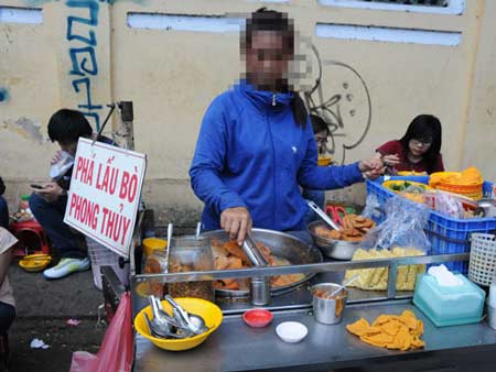 Không hề có một động tác nào gọi là cọ rửa mà chỉ là nhúng chén, đĩa vào xô nước này, tráng qua ở xô nước kia rồi đem lại chỗ bán hàng. Tại đây, chị bán hàng dùng một cái khăn đen ngòm lau qua chén đĩa, tiếp tục múc bán cho khách… Thấy cảnh đó, chúng tôi nhanh chóng thanh toán 30.000 đồng cho 2 chén phá lấu còn ăn dở rồi ra về, tự nhiên thấy cứ nhờn nhợn trong cổ…