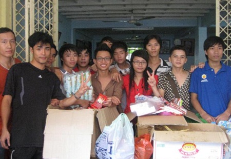 Siêu lừa gửi ảnh đi làm từ thiện cho các nạn nhân (người áo đen đứng thứ hai từ trái sang).