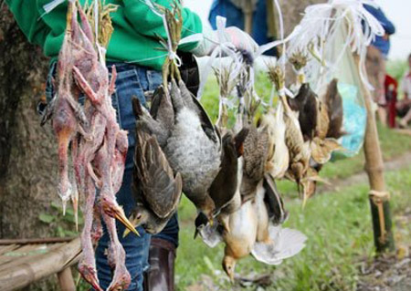 Thấy tôi lắc đầu, một phụ nữ khác tay cầm 2 con vạc lớn, c̣n sống, mắt và miệng đă bị khâu lại bằng lông cánh của chính nó, chào mua: "Chú mua cặp vạc này đi, béo lắm, lấy rẻ 300.000 đồng. Dưới chân chị ta có một chiếc giỏ nhựa mắt lưới loại lớn miệng giỏ bị buộc túm lại, trong đó nhốt gần chục con gà nước, chim cuốc."