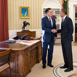 Nhà Trắng cũng công bố bức ảnh chụp ông Obama và Romney bắt tay nhau trong pḥng Bầu Duc, gương mặt cả hai đều tỏ ra thân thiện, vui vẻ.