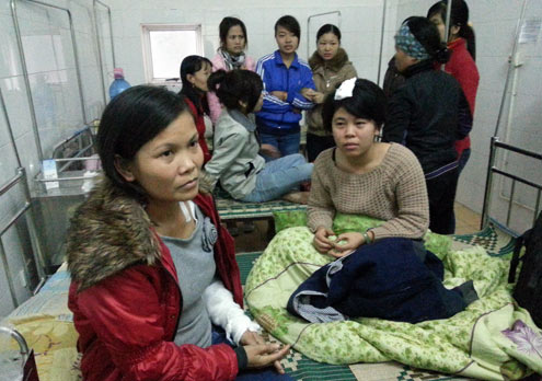 Chị Vũ Thị Hương (băng đầu) và chị Biện Thị Huệ (bị thương ở tay) cùng nhiều công nhân Công ty Sung Woo Vina đang điều trị tại bệnh viện chiều 5/12. Ảnh: Bá Đô.
