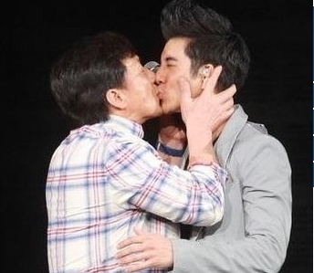 Màn khóa môi giữa Thành Long và Vương Lực Hoành trong liveshow của Lực Hoành hôm 16/9. Ảnh. QQ.