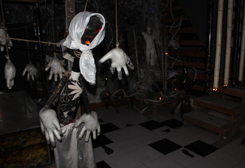 Dọc lối lên tầng hai, những bàn tay màu trắng làm từ găng tay nilon treo lủng lẳng. Viên gạch lát bậc cầu thang vỡ thành nhiều mảnh tạo ra tiếng động lạch cạch khi có bước chân ai đó. Trên tầng áp mái, chiếc sơ mi trắng treo lơ lửng trong ánh đèn mờ ảo. Tiếng gió rít, giọng kể chuyện của Nguyễn Ngọc Ngạn vang lên từ chiếc loa phát ra khắp quán khiến không ít khách nổi da gà.