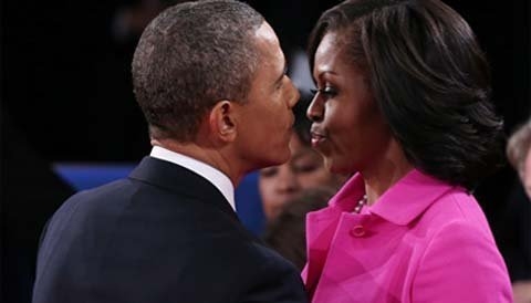 Đệ nhất Phu nhân Michelle Obama trông không có vẻ gì là sẵn sàng đón nhận nụ hôn của chồng bà, Tổng thống Barack Obama, tại cuộc tranh luận ứng viên Tổng thống lần 2 hồi tháng 10.