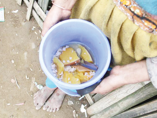 Lên vùng cao, chúng tôi không chỉ nhìn, mà còn ghi hình lại nhiều cảnh ăn uống của học sinh. Có đủ mọi cảnh: 1-Có những học sinh buổi trưa nhịn ăn vì không có gì mang theo đến lớp. Có những bé mầm non đến bữa thì cô giáo phải “véo” từ các nắm cơm của các em khác dồn lại để cho cháu ăn. 2- Có những học sinh không ăn cơm, mà ăn bí, ăn củ. 3- Học sinh có đủ cơm ăn, nhưng thức ăn là măng, muối riềng, muối ớt 4- Học sinh ăn cơm có chút thức ăn mang từ nhà là chút cá khô hay thi thoảng (rất hiếm) có miếng thịt.