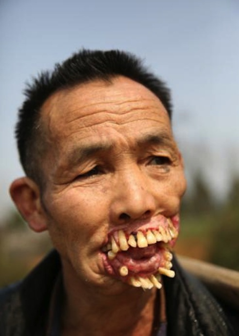 Người đàn ông răng mọc ra ngoài vì sói dại liếm miệng