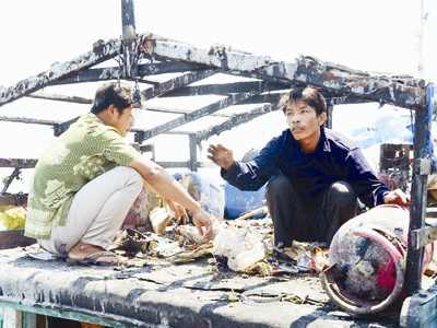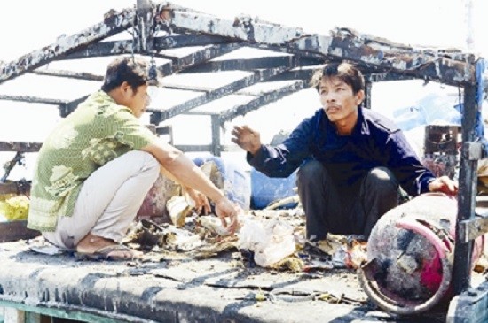Hiện trường tàu cá lúc trở về trên nóc cabin tàu là những chiếc bình gas cháy sém, mì tôm bắt lửa biến thành cơm cháy, quần áo thủng lỗ chỗ... Thuyền trưởng Phải cho biết, chi phí sửa chữa tàu chỉ vài chục triệu đồng, nhưng thiệt hại vì tổn phí chuyến biển lên đến hàng trăm triệu đồng.