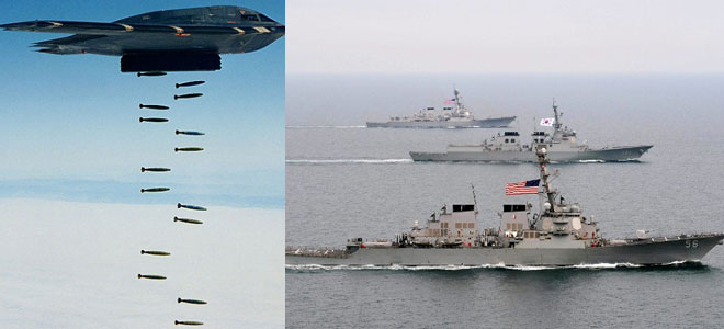 Đầu tiên, Mỹ đưa máy bay ném bom tàng hình B-2 đến Hàn Quốc tập trận. Hôm 28/3, hai chiếc máy bay ném bom tàng hình tối tân B-2 của Mỹ đã thực hiện một cuộc tập trận bắn đạn thật với kịch bản tấn công giả định vào bán đảo Triều Tiên.