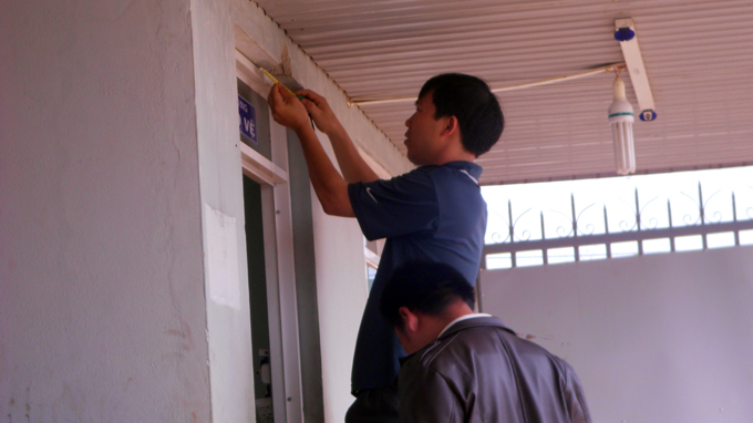 Công an TP Pleiku khám nghiệm vết bắn trên cửa phòng bảo vệ Công ty TNHH MTV Cường Thịnh Phát - Ảnh: TXT