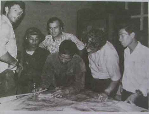 Peter Arnett (người đứng sau hai chiến sĩ Giải phóng) cùng các đồng nghiệp đang xem hai người chiến sĩ chỉ con đường họ đã tiến vào Sài Gòn trên bản đồ (Ảnh chụp lại từ Hồi ký của Peter Arnett).