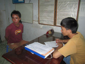 Đối tượng Phước (trái) khai nhận sự việc tại cơ quan điều tra.
