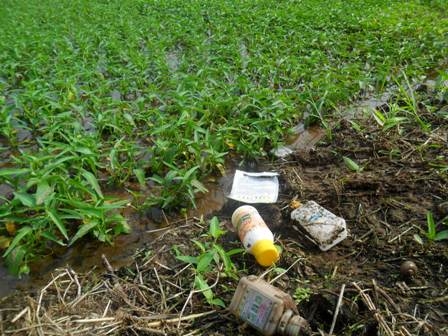 Được sự “mách nước” của bà chủ quán, chúng tôi lần mò ở chân ruộng rau muống nơi mà theo lời khẳng định “mới thấy người ta phun thuốc hôm qua”. Chẳng quá khó khăn, chúng tôi đã tìm được khá nhiều vỏ thuốc được vứt ngổn ngang với nhiều cái tên như: Apphe.666, Anvado 100Wp, Nimaxon 200SL, Amico, Catex 1.8Ec…
