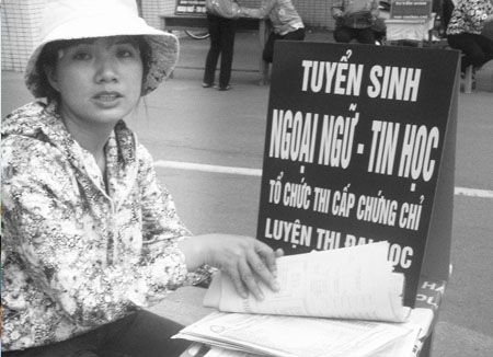 Theo quan sát của PV, trước cổng trường đại học Ngoại ngữ Hà Nội có gần 10 chiếc bàn được kê sát. Trên mặt bàn bày la liệt giấy tờ, từ tờ rơi chiêu sinh khai giảng, sổ biên lai cho đến sổ ghi chép thông tin về học viên. Bên mép bàn, một tấm biển được in đậm ḍng chữ: "Tuyển sinh ngoại ngữ, tin học, tổ chức thi cấp chứng chỉ, luyện thi đại học". Điều lạ rằng, những "suất" ki ốt di động này không phải người b́nh thường nào cũng có thể ngồi được vào vị trí đắc địa đó. Họ hầu hết là người dân gần khu vực, những nhân công từng có thời gian lao động hoặc quan hệ thân thiết với người trông giữ xe tại trường. Các chủ ki ốt "chợ đen" là nơi cung cấp "nguồn hàng" cho các Trung tâm Ngoại ngữ Viet - Edu 1, trung tâm Ngoại ngữ - tin học 12A7… nằm gần khu vực trường đại học Ngoại ngữ.