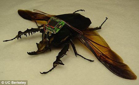 Trước đây, nhóm nghiên cứu của kỹ sư điện tử Hirotaka Sato, Đại học California ở Berkeley cấy thành công những điện cực vào não bọ cánh cứng cho phép kiểm soát chuyển động bay của côn trùng. Hệ thống gài trên lưng con bọ là thiết bị kích thích thần kinh, thiết bị kích thích cơ, một bộ vi kiểm soát để truyền và nhận tín hiệu và một nguồn năng lượng.