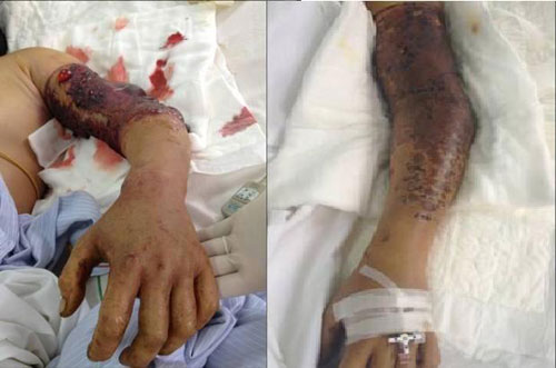 Trong lúc đi vào rừng (ngày 31/5/2013), chị Cháng Thị T. bất ngờ bị một con rắn màu xám lao ra cắn vào cánh tay trái. Khoảng một giờ sau, khi thấy cánh tay bắt đầu sưng nề, đau buốt, chảy máu tại chỗ cắn, chị T. mới vào BV Đa khoa tỉnh Hà Giang. Tại đây, bệnh nhân được điều trị kháng sinh, truyền dịch, giảm đau… nhưng không đỡ nên đã được chuyển dến trung tâm Chống độc (BV Bạch Mai) điều trị ngày 1/6.