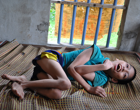 Hai đứa con không bình thường, khiến chị Sang đau đến thắt ruột. Lần thứ 3 vượt cạn chị mong mỏi ông trời bù đắp cho đứa con lành lặn, khỏe mạnh để làm chỗ dựa tinh thần nhưng không được. Cô con gái Trần Thị Thúy (4 tuổi) có gương mặt đẹp, xinh xắn, đáng yêu nhưng nụ cười méo xệch. Ấy thế nhưng con bé rất hay cười vì nó phải dỗ anh Thịnh không được hét mỗi lần mẹ nấu cơm. Mỗi lần nhìn con như thế, chị Sang chỉ biết cúi đầu để nỗi đau cứ lắng lại ngấm vào từng đường gân, thớ thịt của mình.