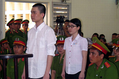 Nguyễn Phương Uyên (trái) và Đinh Nguyên Kha (phải) trong phiên tòa phúc thẩm ngày 16/8/2013 tại Long An. Phiên tòa tuy được tuyên bố là “công khai” nhưng ngồi chứng kiến chỉ toàn là Công An đủ kiểu. Thân nhân, bằng hữu, người dân không được tới gần. (Hình: AFP/Getty Images)
