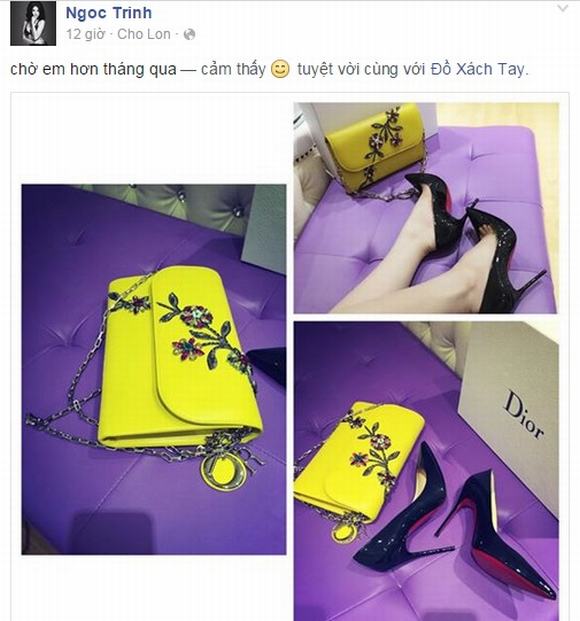 Ngọc Trinh khoe túi và giầy hàng hiệu mới tậu. Người đẹp tỏ ra không bận tâm đến vụ lùm xùm "khẩu chiến" facebook trước đó với Khánh My.