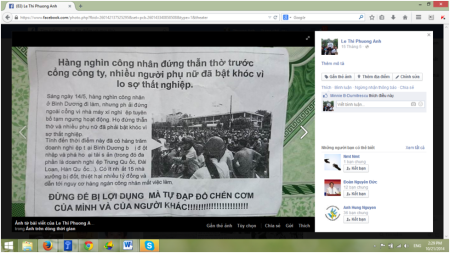 Trên thực tế, sáng 15.5.2014, Phương Anh đưa tin trên Facebook là “Sinh viên một số trường được nhà trường huy động để rải truyền đơn tuyên truyền phải trái cho anh em công nhân”, kèm theo đó là những ảnh chụp lời kêu gọi công nhân chấm dứt biểu tình bạo loạn.
