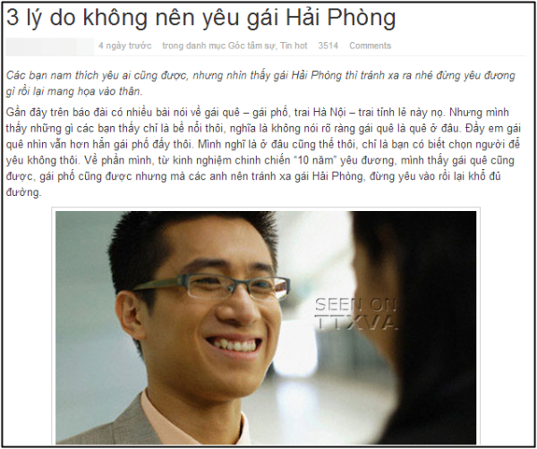 Mới đây bài viết “3 lí do không nên yêu gái Hải Phòng” được đăng tải trên một diễn đàn đã bị cộng đồng mạng phản ứng vô cùng gay gắt. Đa số ý kiến đều cho rằng đó là một bài viết phiến diện, tiêu cực, và phân biệt vùng miền. Thậm chí nặng nề hơn họ còn chỉ trích người đàn ông đó là hèn hạ, thiếu suy nghĩ, thiếu nhân cách và không có học thức.
