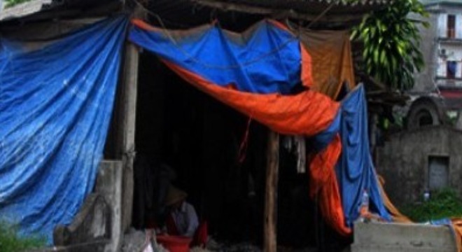 Ghé vào một căn nhà (đúng hơn gọi là lều) tuềnh toàng, lụp xụp, vách và mái dựng tạm bằng những tấm phibrô-ximăng, mảnh bạt rách, cả 4 hướng bị những ngôi mộ vây quanh. Chủ nhân là chị Dung, 47 tuổi, cho biết ở đây đã ngót 5 năm.