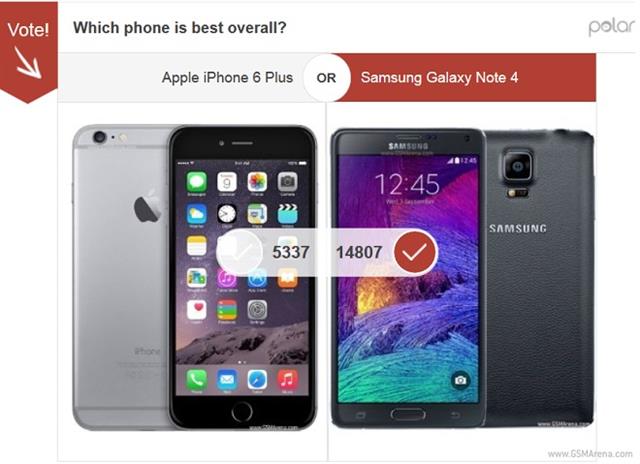 Đầu tiên là so sánh thiết kế, Galaxy Note 4 đã đạt tỷ lệ phiếu 67% trong gần 20.000 người bỏ phiếu bình chọn, tỷ lên với iPhone 6 Plus là 2:1.